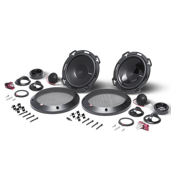 The P16-S is a 6" 2-way component system with 1" soft dome tweeters and is rated at 60 watts RMS. The system includes a pair of tweeters, two woofers with grilles, integrated crossovers, and mounting hardware.